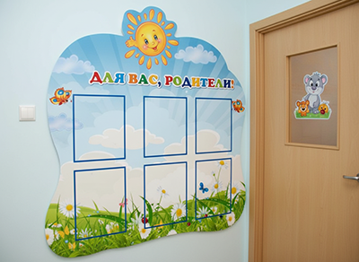 Классический вариант у входа в группу или на ресепшене. Это идеальный информационный стенд для группы, где размещают расписание, новости и памятки по здоровью.